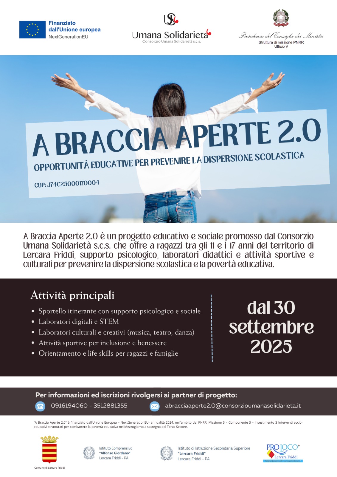 Il Consorzio Umana Solidarietà s.c.s., in partenariato con il Comune di Lercara Friddi, l’Istituto di Istruzione Secondaria Superiore “Lercara Friddi”, l’Istituto Comprensivo “Alfonso Giordano” e la Pro Loco Lercara Friddi, annuncia l’avvio del progetto A Braccia Aperte 2.0 – Opportunità educative per prevenire la dispersione scolastica.