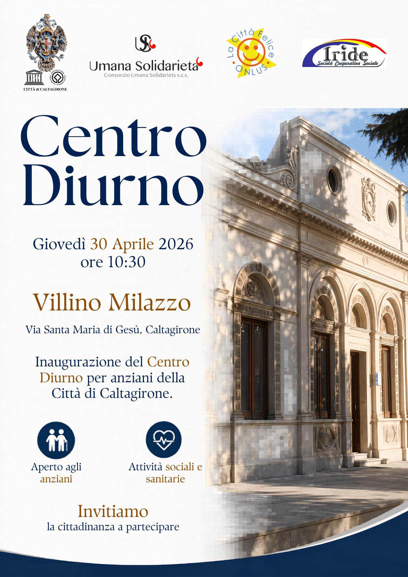 Il Consorzio Umana Solidarietà s.c.s., e l’Associazione La Città Felice onlus, in collaborazione con il Comune di Caltagirone, inaugurano il Centro Diurno per anziani della Città di Caltagirone, un nuovo presidio territoriale dedicato al rafforzamento della rete dei servizi sociali e sanitari.