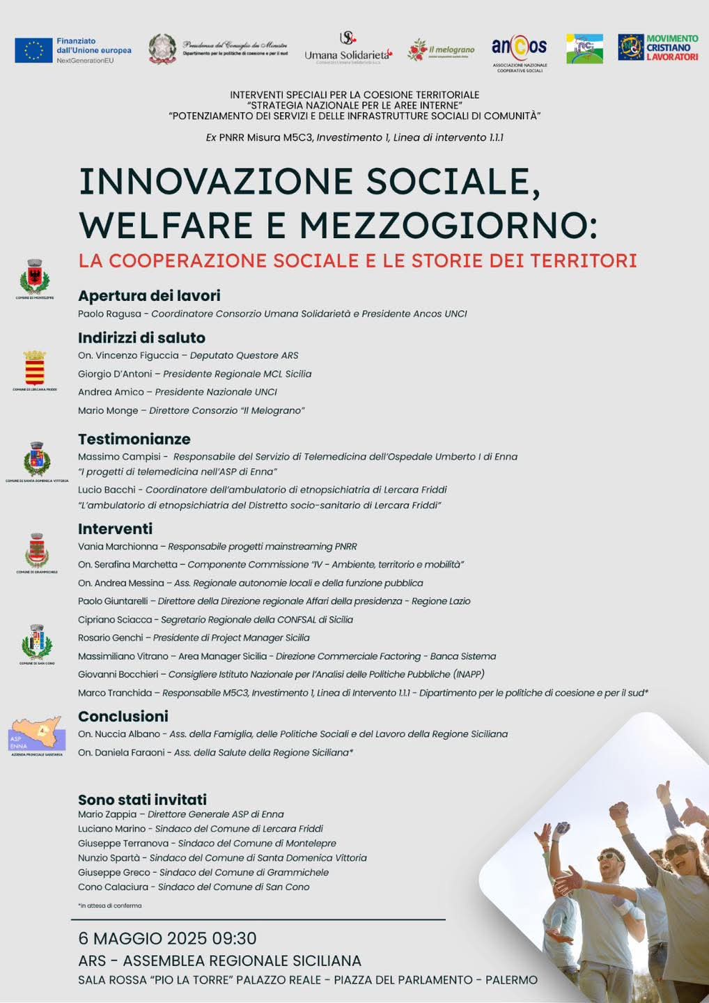 Il convegno dal titolo “Innovazione Sociale, Welfare e Mezzogiorno: La Cooperazione Sociale e le Storie dei Territori” è organizzato dal Consorzio Umana Solidarietà s.c.s, in collaborazione con MCL (Movimento Cristiano Lavoratori), ANCOS UNCI (Associazione Nazionale delle Cooperative Sociali aderenti all’UNCI) e il Consorzio Il Melograno.