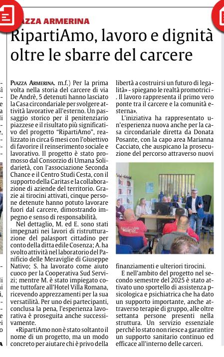 Una ventata di speranza sta attraversando le celle della casa circondariale di Piazza Armerina. Non si tratta solo di parole o di buone intenzioni ma di fatti concreti che, negli ultimi sei mesi, hanno cambiato la prospettiva di chi vive privato della libertà. Il progetto RipartiAmo ha dimostrato di essere molto più di un titolo accattivante, trasformandosi in un vero e proprio strumento operativo per costruire un futuro basato sulla legalità. L’iniziativa nasce dalla sinergia tra il Consorzio di Umana Solidarietà, l’associazione Seconda Chance e il Centro Studi Cesta. Insieme hanno attivato una serie di percorsi, sia interni che esterni alla struttura penitenziaria, con l’obiettivo di tracciare un cammino nuovo per i detenuti. Si è creato un legame solido tra la città e un mondo spesso percepito come distante e complesso, valorizzando risorse umane che possono rivelarsi utili per l’intera comunità.