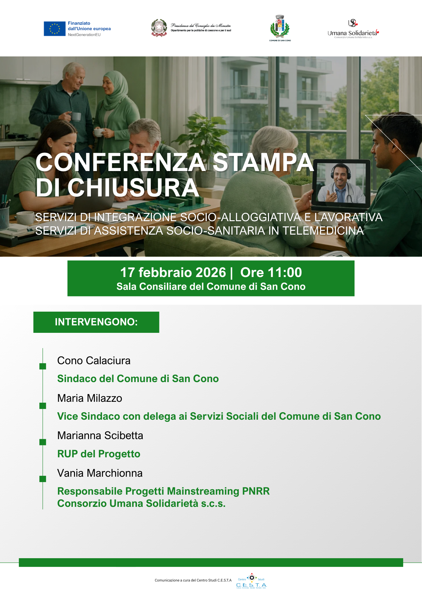 Domani, martedì 17 febbraio alle ore 11.00, presso la Sala Consiliare del Comune di San Cono, conferenza stampa di chiusura del progetto dedicato ai servizi di integrazione socio-alloggiativa e lavorativa e ai servizi di assistenza socio-sanitaria in telemedicina, realizzati dalla Presidenza del Consiglio dei Ministri, Dipartimento per le politiche di coesione e per il Sud, nell’ambito delle misure finanziate dall’Unione Europea – NextGenerationEU con fondi PNRR.